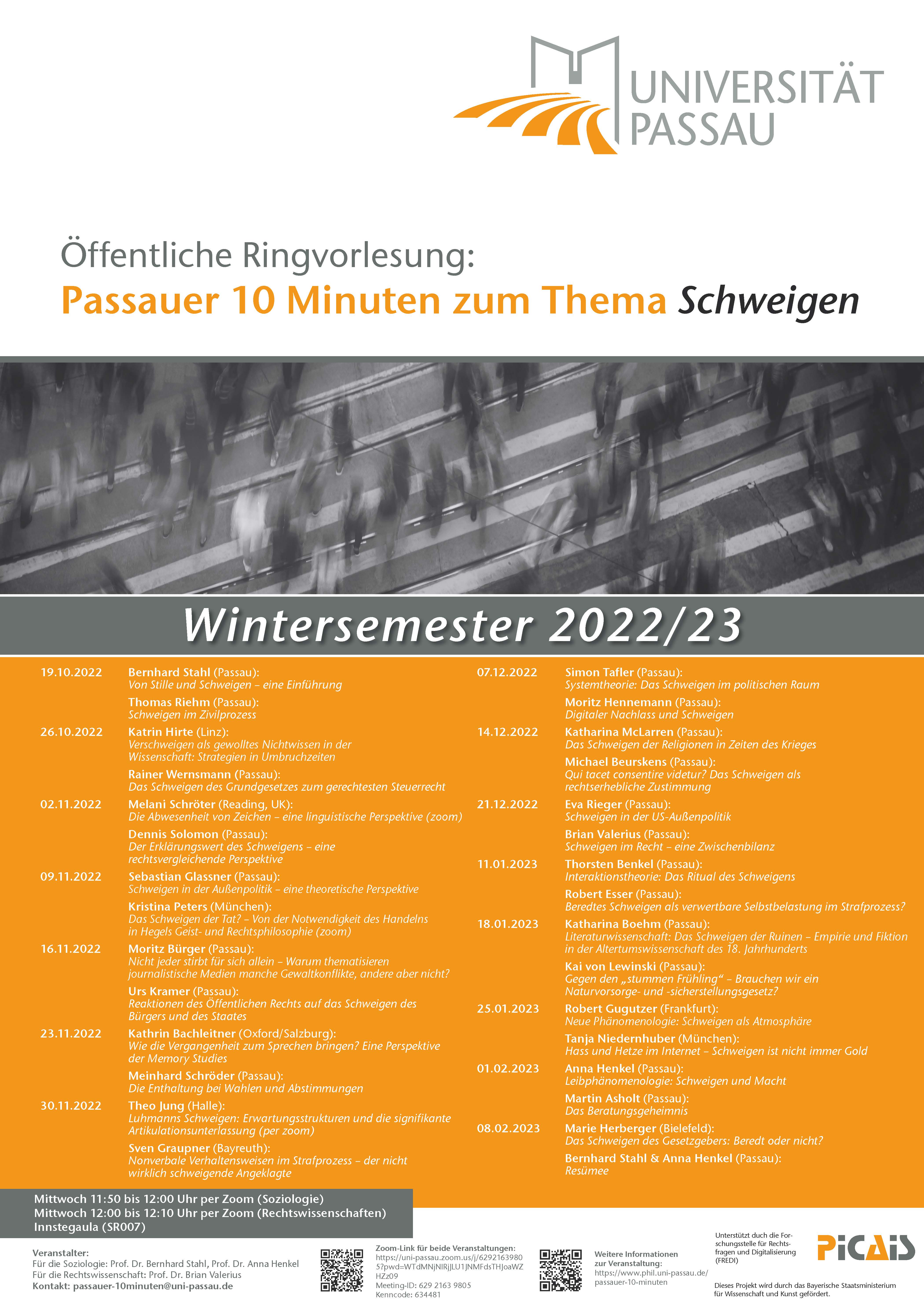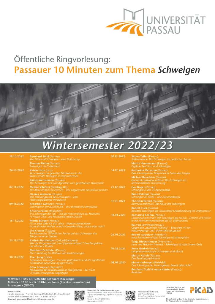 In the coming months, the University of Passau organizes a series of 10-minute lunchtime lectures on silence. Most contributions come from law and sociology, but other disciplines are also represented.